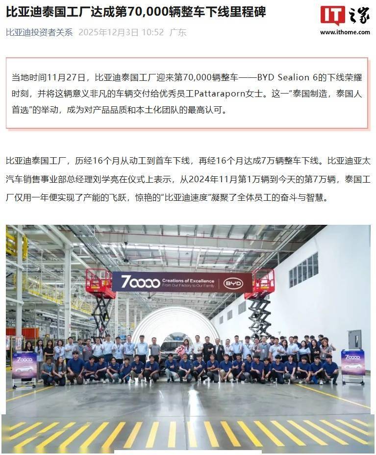 比亚迪在东南亚的电动汽车布局迎来重要里程碑。当地时间11月27日,泰国罗勇府工业区内,一辆BYD Sealion 6缓缓驶下生产线,成为比亚迪泰国工厂下线的第7万辆整车。这辆象征性车辆被交付给工厂优秀员工帕塔拉蓬(Pattaraporn),标志着该基地正式运营32个月后达成关键产能节点。