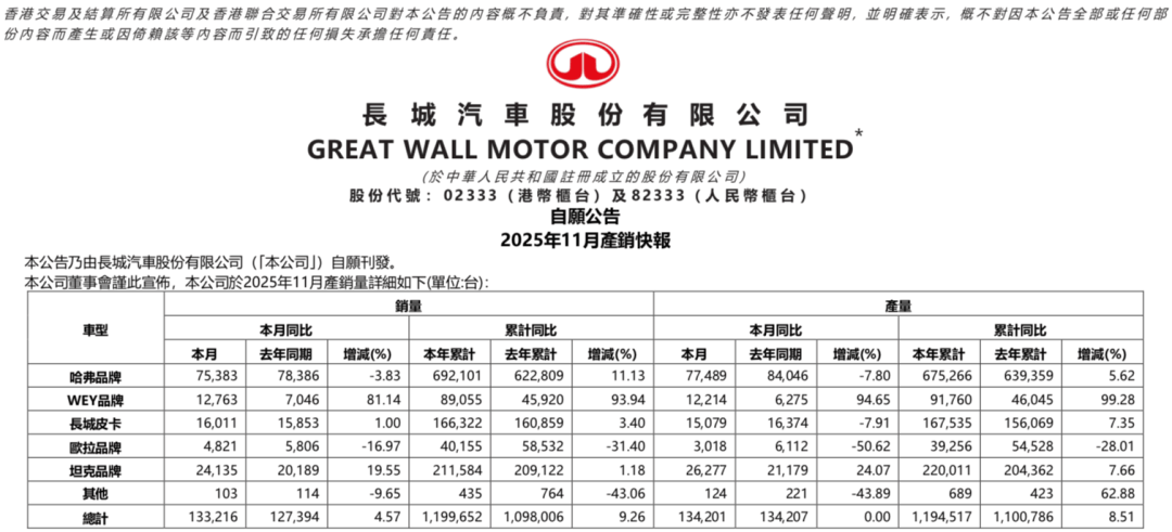 长城汽车近日公布了其2025年11月及1至11月的销售数据,展现出稳健的市场表现。数据显示,11月长城汽车共售出133216辆汽车,同比增长4.57%。其中,新能源汽车销量达到40113辆,海外销量则为57309辆。从年初至11月,长城汽车累计销量已突破1199652辆,同比增长9.26%,新能源汽车和海外销量分别达到364731辆和448648辆。