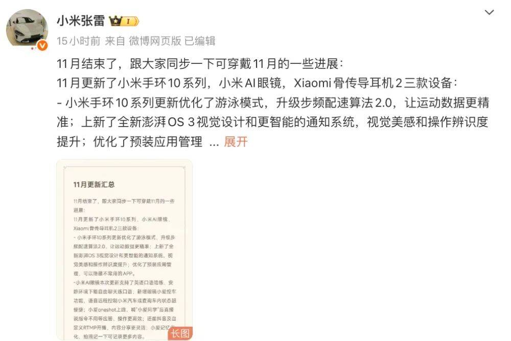 在智能穿戴领域,小米集团同步更新了多款产品。11月已推出小米手环10系列、小米AI眼镜及Xiaomi骨传导耳机2,12月还将迎来新一轮升级。小米手环9新版本将搭载OS3系统,界面设计焕新,优化焦点通知展示效果与系统流畅度,新增运动异常提示、数据保存及GNSS引导页面优化,步频配速算法升级,并支持隐藏预装应用与YU7 NFC车钥匙功能。