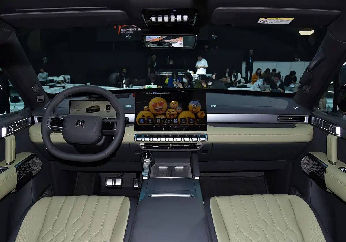 进入车内,粗犷与精致形成鲜明对比。T字形中控台采用阶梯式布局,双色拼接材质营造出层次感,10.25英寸液晶仪表与15.6英寸悬浮中控屏组成科技双屏组合。为方便越野操作,中控屏下方保留了一排物理按键,同时配备W-HUD抬头显示、流媒体后视镜等实用配置。车机系统搭载简化版鸿蒙座舱,支持智慧分屏和手机互联功能。座椅采用仿皮材质包裹,前排配备加热、通风和记忆功能,后排提供加热服务,确保全舱乘客的舒适体验。