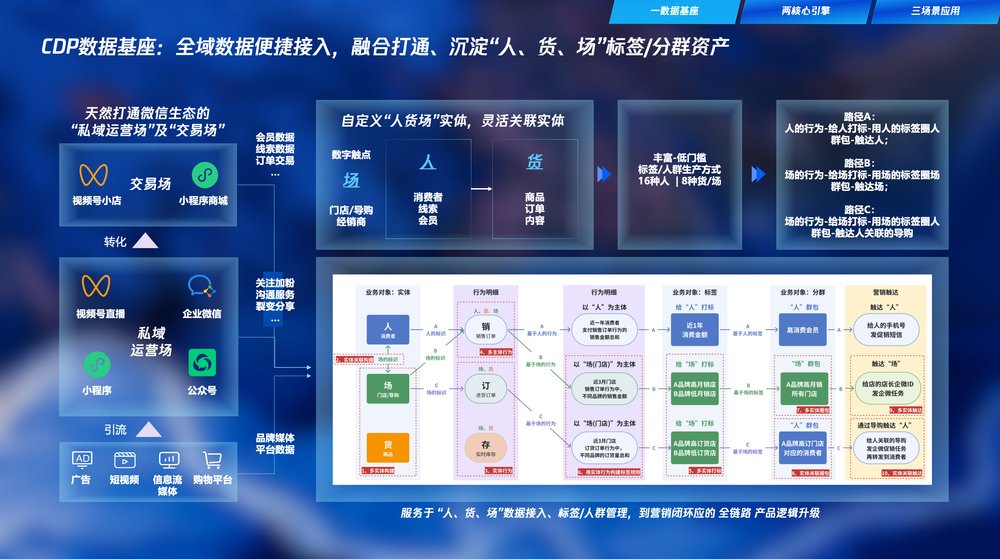 2020年起,腾讯开始打造聚焦“人(用户)”的全生命周期、全渠道数据整合的CDP。2023年,腾讯企点营销云CDP拓展连接“人、货、场”多业务实体,同时让微信生态私域数据更便捷。
