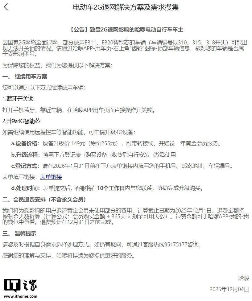 哈啰电动自行车近日发布重要公告,针对因国家2G网络全面退网导致部分车辆出现使用异常的情况,向受影响用户提供详细解决方案。经核实,使用EB11、EB20智能芯且车辆编号以310、315、318开头的车型,可能面临无法通过远程控制开关锁的问题。