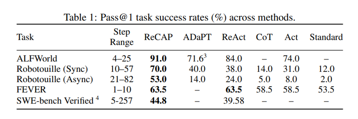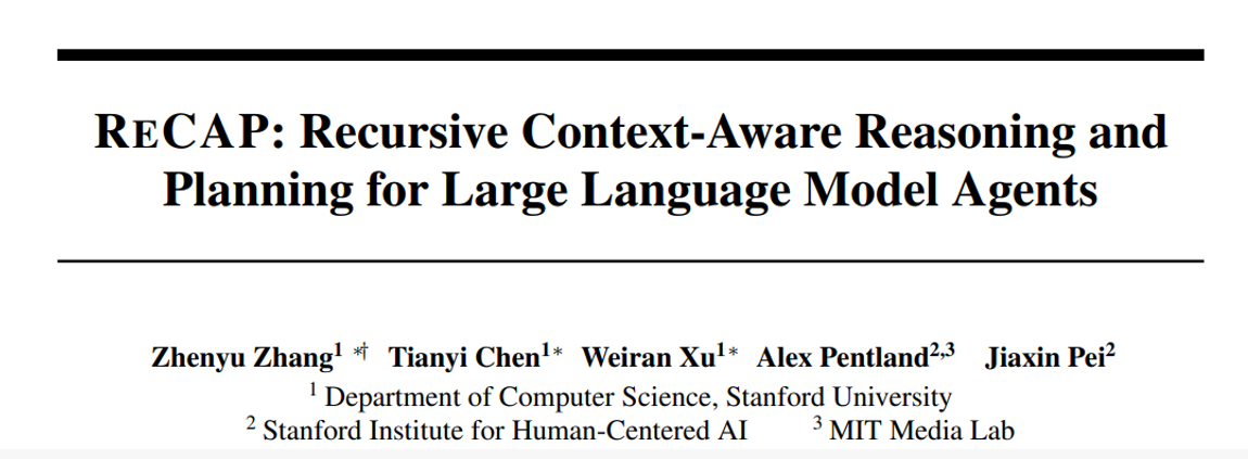 来自斯坦福大学与MIT的研究团队给出了肯定答案,正式发布的AI Agent推理新框架——ReCAP(递归上下文感知推理与规划),从真正意义上统一了序列推理和层级推理,在多种任务中全面战胜了ReAct,且继承了ReAct示例简单、高通用性,和即插即用的优势。