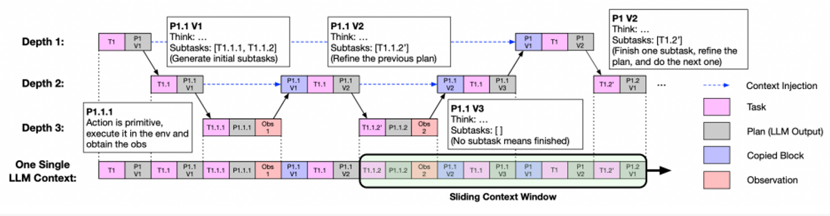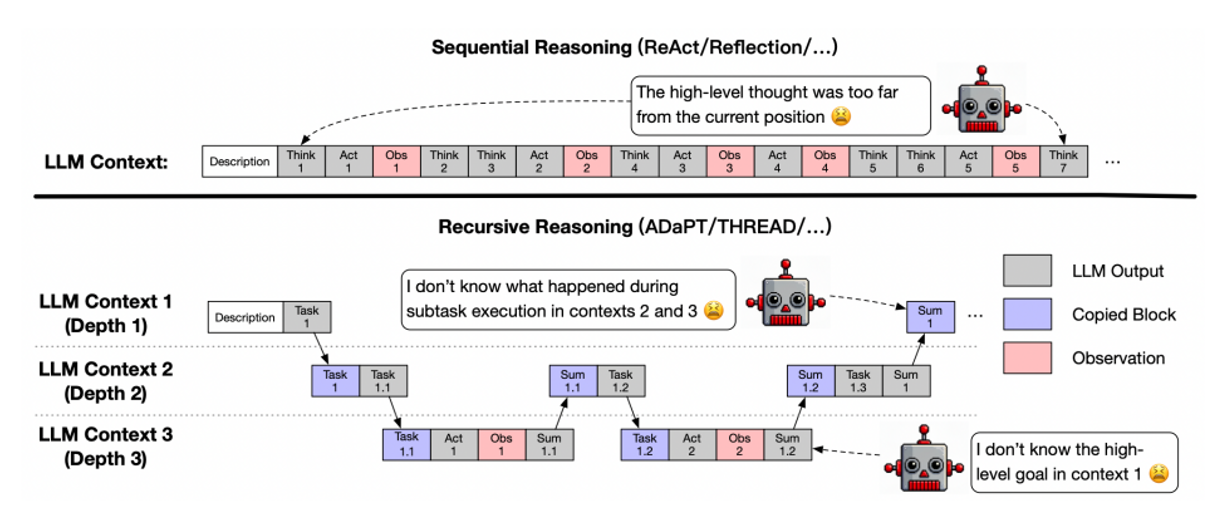 层级推理(例如ADaPT,THREAD)将任务分解为子任务来明确目标,但给子任务单独分配上下文示例和提示词,导致上下文断层和成本爆炸。