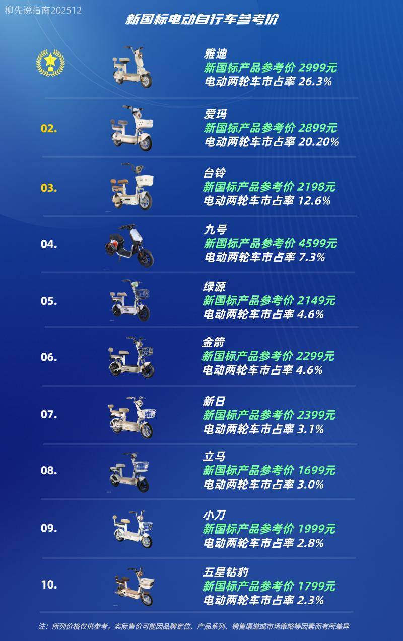 头部企业凭借规模效应与研发积累,在市场转型期占据先发优势。2025年上半年数据显示,雅迪、爱玛、台铃三大品牌分别以26.3%、20.2%、12.6%的市场占有率稳居前三。其新国标产品线呈现明显分层:入门级车型定价集中在2198-2999元区间,中高端产品则突破3000元门槛。九号公司作为中高端市场的重要参与者,通过强化智能交互系统、提升设备连接性能等差异化策略,将主力产品定价维持在3000元以上价位段。