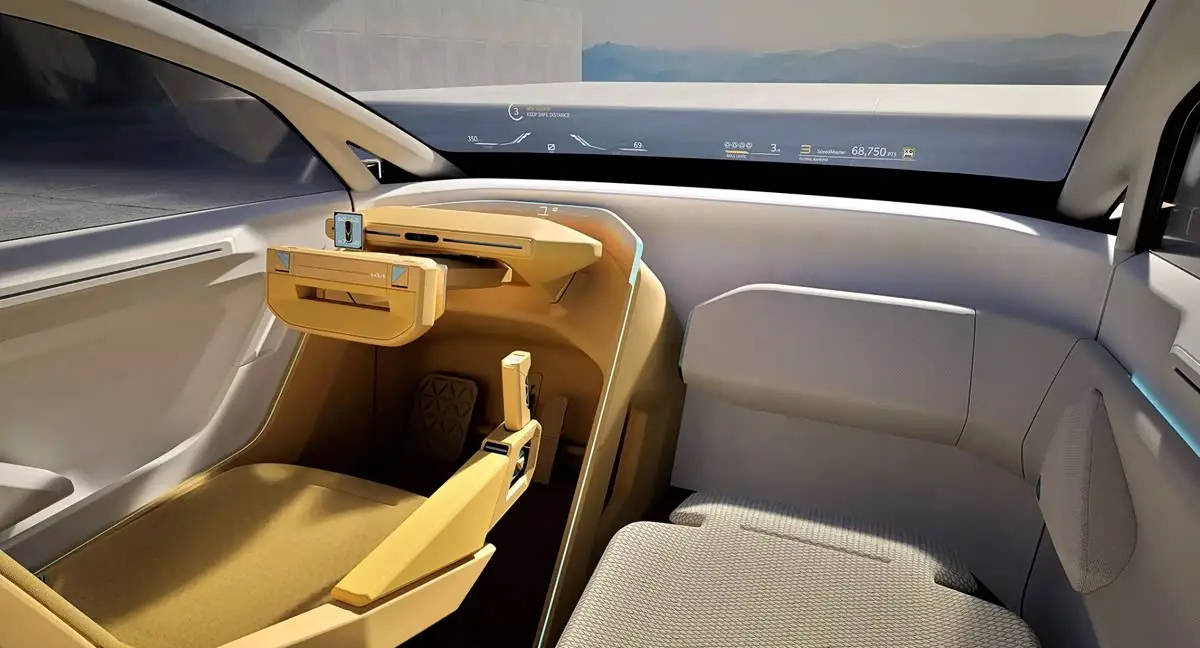 内饰空间突破传统布局,创新性地提供三种交互模式:极速者模式强化驾驶数据呈现,梦想家模式侧重环境氛围营造,游戏玩家模式则支持多媒体娱乐功能。所有模式均通过增强现实抬头显示系统投射至前挡风玻璃,配合方向盘上方的小型显示屏与环抱式仪表系统,构建出沉浸式驾驶舱体验。座椅采用双色拼接设计,主副驾座椅在材质与色彩上形成鲜明对比,面部监测系统可实时感知驾驶员状态并调整车内环境。