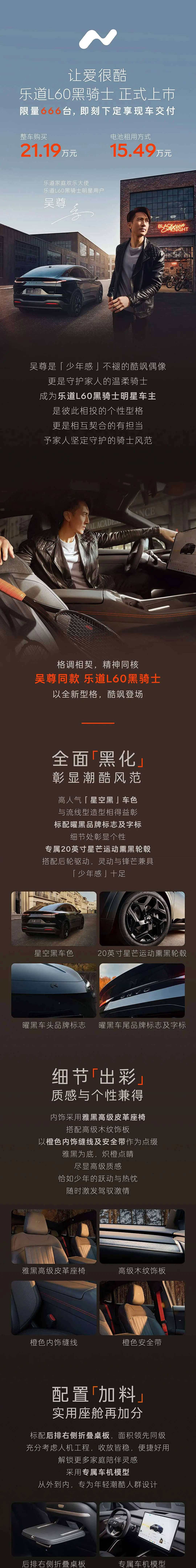 乐道汽车近日推出了一款备受瞩目的特别版车型——L60黑骑士版,正式开启市场销售。这款新车以独特的黑化设计语言和限量发售策略,迅速吸引了众多消费者的目光。此次上市的乐道L60黑骑士版,官方指导价为21.19万元,若选择BaaS电池租用方案,购车价格可降至15.49万元,进一步降低了消费者的购车门槛。