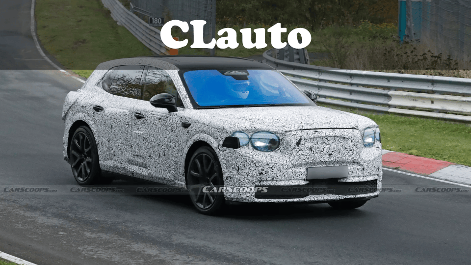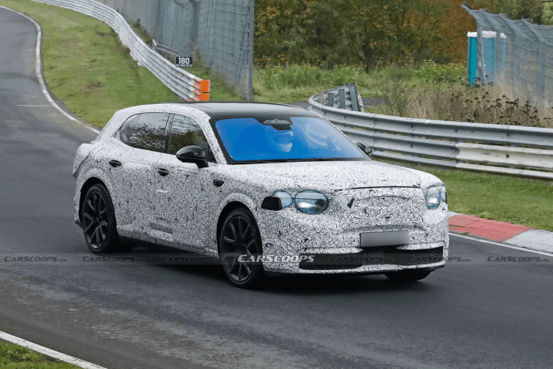 新车近期在德国纽北赛道进行测试时被拍到谍照,车身覆盖严密伪装,仅能通过轮廓判断其尺寸小于添越,车顶线条更低矮,整体姿态接近轿跑型SUV。伪装贴纸中嵌入了四个圆形假灯组,与现款添越的设计语言形成呼应,但实际灯组造型或与几个月前发布的EXP15概念车不同——后者采用了垂直布局的未来感大灯设计。前格栅区域同样被遮挡,具体形状尚未明确。