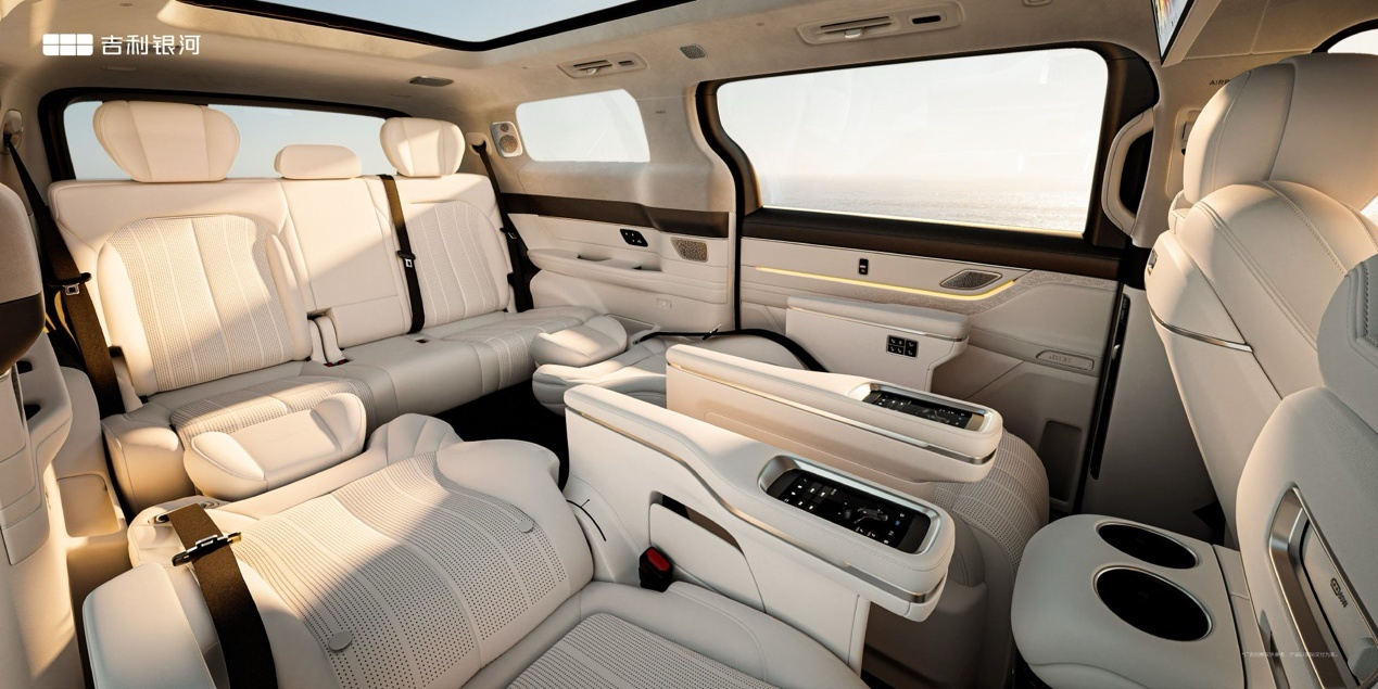 内饰空间布局上,银河V900提供6/7/8座三种选择,二排与三排空间均超过1013mm,后备箱容积达1100L。座椅采用Nappa全粒面真皮包裹,支持加热、通风、SPA级按摩及电动调节功能,后排配备17.3英寸娱乐屏。科技配置方面,新车搭载Flyme Auto 2.0车机系统,内置骁龙8295P旗舰芯片,集成DeepSeek与吉利自研星睿AI大模型,全车配备4个50W风冷无线快充。