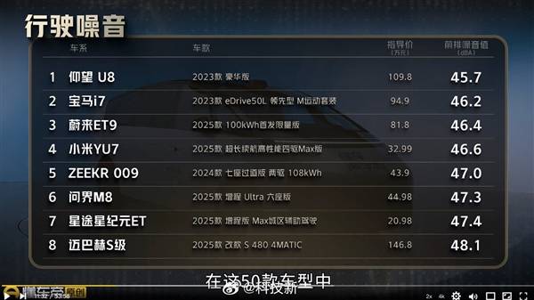 测试环境采用90dBA标准粉噪模拟真实场景,小米YU7的静态隔音表现不仅超越了同场竞技的百万级豪华车型,更在动态行驶测试中延续了亮眼发挥。数据显示,其前排行驶噪音值为46.6dBA,位列榜单第四名,仅稍逊于仰望U8(45.7dBA)、宝马i7(46.2dBA)和蔚来ET9(46.4dBA),而迈巴赫S级等传统豪华车型则被甩在身后。这一成绩表明,小米YU7在噪声、振动与声振粗糙度(NVH)控制领域已达到行业高端水准,无论是驻车时的静谧性还是行驶中的舒适性均表现突出。