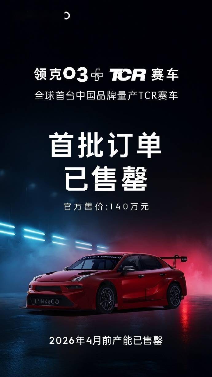 领克汽车近日宣布,其推出的全球首款中国品牌量产TCR赛车——领克03+ TCR赛车,首批订单已全部售罄,当前产能已排至2026年4月前。这款高性能赛车的官方指导价为140万元,凭借其专业级配置和出色的性能表现,迅速吸引了众多赛车爱好者的关注。