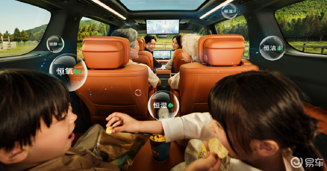 健康座舱成为至境世家的核心卖点之一。内饰采用“水生美学”设计语言,大量运用全粒面Nappa真皮与澳洲羊毛地毯等高端材质。车辆搭载“五恒”健康系统,通过松下nanoe™X空气净化技术、OEKO-TEX婴儿级认证座椅皮革等配置,实现恒温、恒湿、恒氧、恒洁、恒静的座舱环境。官方数据显示,其电磁辐射值低于普通手机,进一步强化健康属性。智能座舱方面,高通8775芯片支撑起多屏交互生态,前排配备16.3英寸中控屏与副驾娱乐屏,后排设置21英寸4K智慧屏,尊享版车型更提供50英寸AR-HUD抬头显示。第二排座椅扶手内置双5.5英寸触摸屏,可控制700余项车控功能,语音助手支持分区唤醒与AI大模型交互。