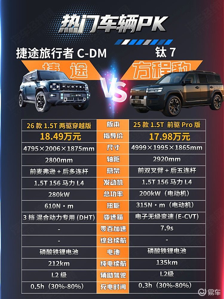 对于注重城市通勤与智能体验,周末偶尔轻越野的消费者而言,方程豹钛7凭借比亚迪的三电技术和L2级满配辅助驾驶系统,能在复杂路况下提供更可靠的驾驶支持;而如果是续航需求较高、偏好硬派细节设计的用户,捷途旅行者C-DM的212公里纯电续航和侧开尾门“小书包”设计,则能更好地满足日常使用和轻度越野场景的需求。