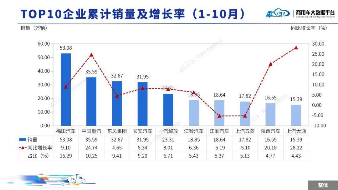商用车市场的竞争格局正呈现出头部企业集中与差异化竞争并存的特点。2025年1月至10月期间,市场前五名的商用车厂商合计占据超过五成的市场份额。这一现象反映出,在技术升级和市场竞争加剧的背景下,企业的规模效应和综合实力对其发展至关重要。具体来看,销量前五名的企业依次为福田汽车、中国重汽、东风集团、长安汽车和一汽解放。这些企业凭借完整的产品线、完善的销售服务网络以及持续的技术创新,在市场中确立了稳固的领导地位。其中,福田汽车以53.08万辆的累计销量位居榜首,同比增长9.10%,表现略优于行业平均水平。其成功得益于全系列商用车布局和新能源转型的前瞻性战略,特别是在轻卡和新能源物流车领域的优势地位。目前,福田汽车已连续多年位居中国商用车行业销量榜首,产品和服务覆盖全球130多个国家和地区。