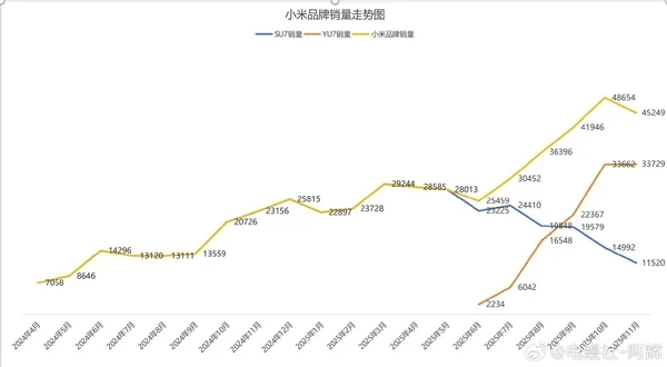 转机出现在2025年6月。随着小米YU7正式开启交付,品牌销量结构发生显著变化。这款定位中高端的SUV车型展现出强劲的市场竞争力,上市第三个月即突破1.6万辆交付量,11月更是达到33729辆的惊人成绩。虽然SU7同期销量有所下滑,但双车协同效应下,小米品牌整体销量持续走高,11月总交付量达45249辆,较YU7上市前的5月增长超61%。