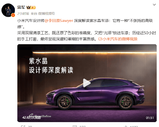 小米汽车创始人雷军在社交平台转发设计师田原对紫水晶车漆的解读时表示,这款配色“低调中透着高级感”。据介绍,该车漆采用双层清漆工艺,通过特殊处理使色彩还原度更高,同时将光泽感牢牢锁入漆面。从制作工艺来看,每一台车的漆面都需经过近50小时的手工打磨,最终呈现出深邃与璀璨交织的独特质感。