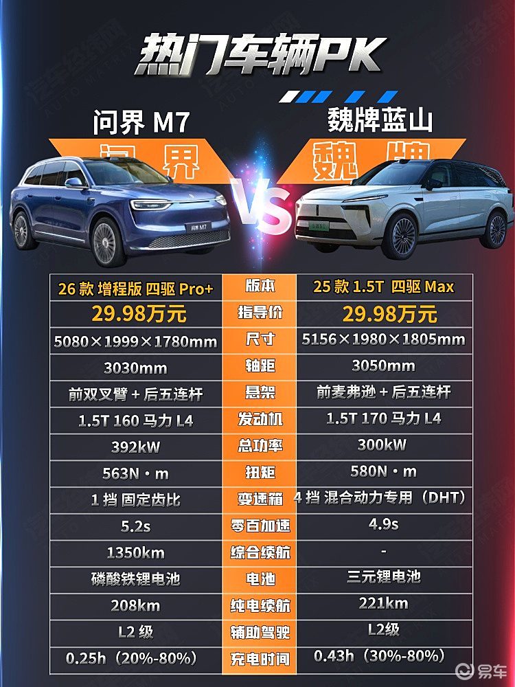 在30万级中大型SUV市场中,国产高端车型正以强劲实力赢得消费者青睐。问界M7与魏牌蓝山作为该细分领域的代表车型,凭借各自的技术优势与产品定位,成为高端家庭用户购车时的重要选项。两款车型指导价均为29.98万元,却在设计理念、动力配置与智能体验上展现出差异化竞争态势。