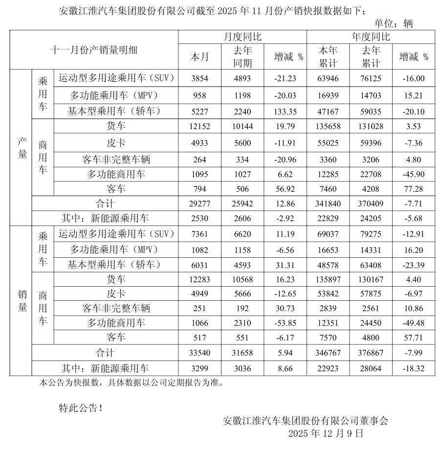 产销数据方面,江淮汽车公布的最新运营报告显示,2025年11月整体销量达33540辆,同比增长5.94%。其中新能源乘用车板块表现突出,单月销量3299辆,同比增长8.66%。渠道整合与销售数据增长的关联性,将成为观察企业转型成效的重要指标。