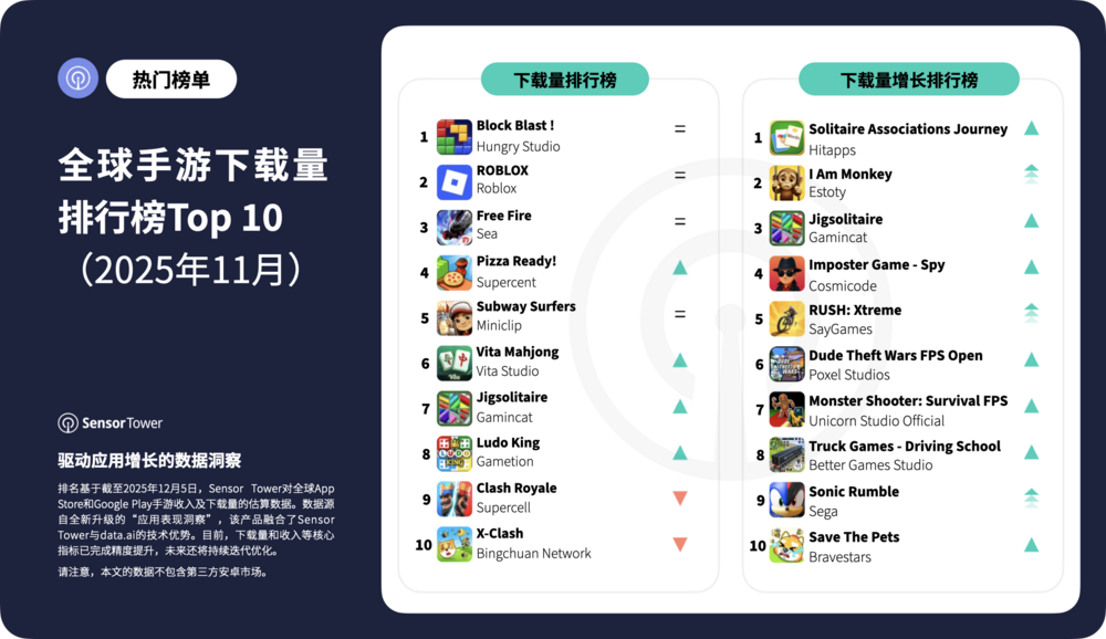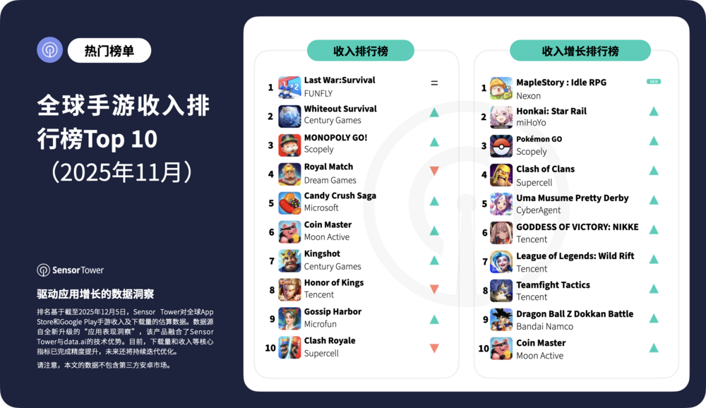 根据Sensor Tower发布的最新报告,2025年11月全球手游市场呈现出收入与下载量双线并进的格局,头部产品通过节日运营活动持续巩固优势,新兴游戏则凭借创新玩法快速崛起。在收入榜单中,FUNFLY发行的《Last War: Survival Game》连续第二个月蝉联全球手游收入冠军,其通过联盟社交机制与高价值奖励系统,在主要市场保持强劲变现能力。紧随其后的是《Whiteout Survival》,该作凭借“霜龙暴君”高风险挑战与感恩节主题活动,成功跃升至第二位。