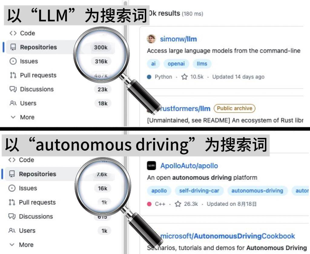 在智能驾驶领域,开源与闭源的路线之争正引发广泛关注。以特定搜索词为指标的代码仓库数量对比显示,相关技术生态的活跃度存在显著差异。数据显示,以某一技术关键词为搜索词的代码仓库数量达30万个,而以"autonomous driving"为关键词的搜索结果却不足1万个,两者规模相差近40倍。这种差距折射出不同技术路线在开发者参与度上的悬殊对比。