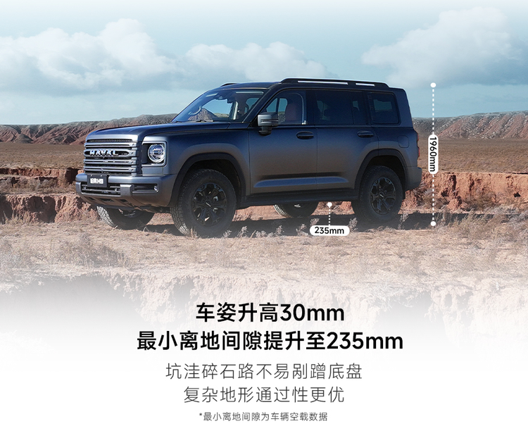 通过性方面,二代哈弗H9穿越版进行了针对性升级。车身高度升高30mm,最小离地间隙提升11mm,空载状态下达到235mm,配合优化后的接近角与通过角,面对坑洼碎石路也能有效避免底盘剐蹭。新车标配265/65R18规格的AT越野轮胎,胎面更厚、花纹更深,具备更强的复杂路况适配能力。驾驶模式升级至9种,新增岩石模式与专家模式,搭配TOD+Mlock+前后锁的“三把锁”配置,再加上低速越野巡航、坦克转弯、540°全景影像等实用功能,即使是没有丰富越野经验的新手,也能从容应对各类复杂地形。