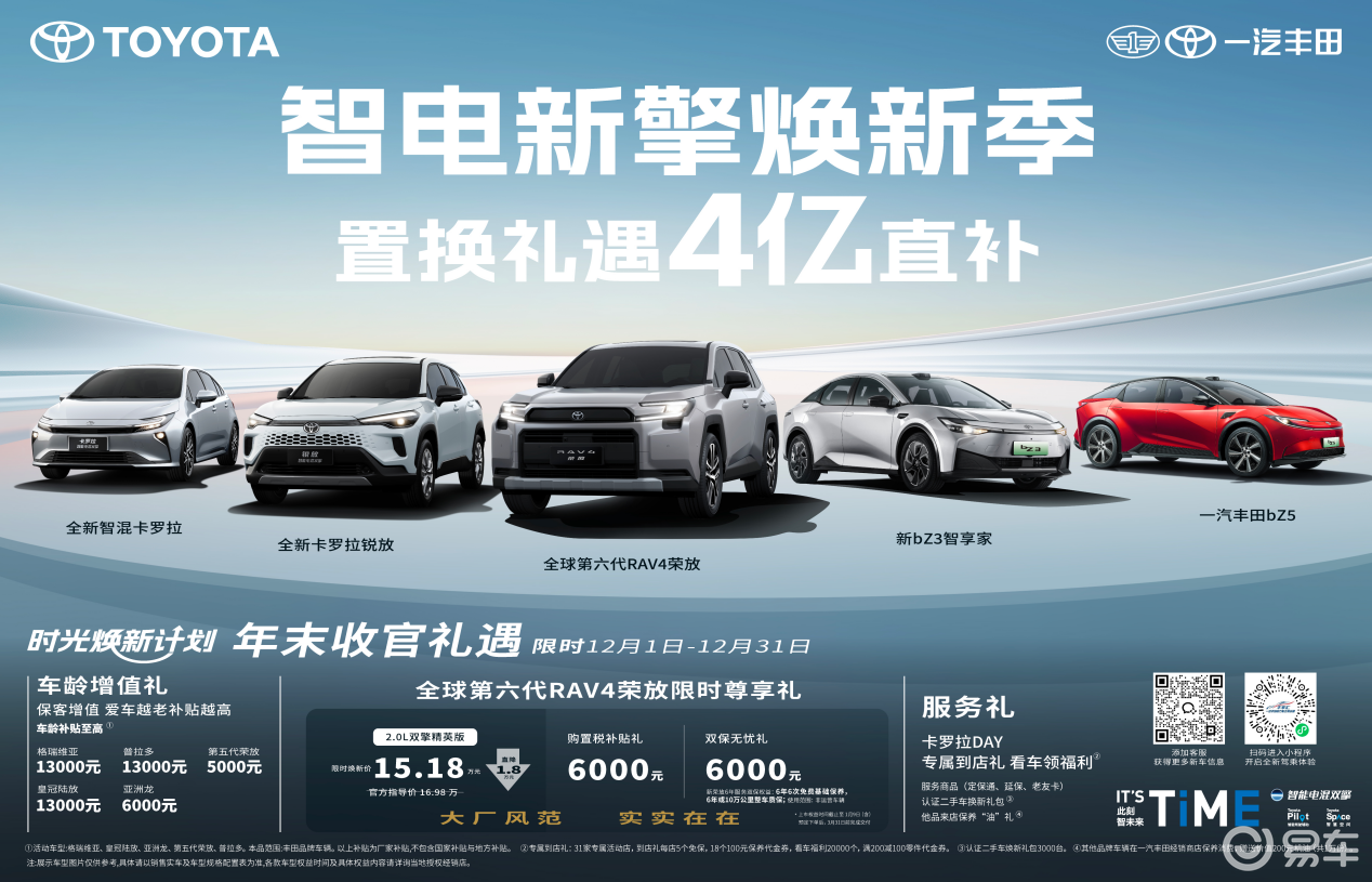 为回馈用户,一汽丰田在12月1日至12月31日期间推出“智电新擎焕新季”活动,以4亿元厂家直补为用户带来更多实惠。全球第六代RAV4荣放官方指导价为16.98万元的2.0L双擎精英版限时焕新价15.18万元,还可叠加享受6000元的置购税补贴礼和6000元的6年6次免费基础保养及6年或10万公里整车质保的双保无忧礼。皇冠陆放、格瑞维亚、普拉多等重磅车型可享至高1.3万元的车龄增值礼,卡罗拉DAY专属到店礼等服务礼遇也为消费者创造了最佳购车时机。