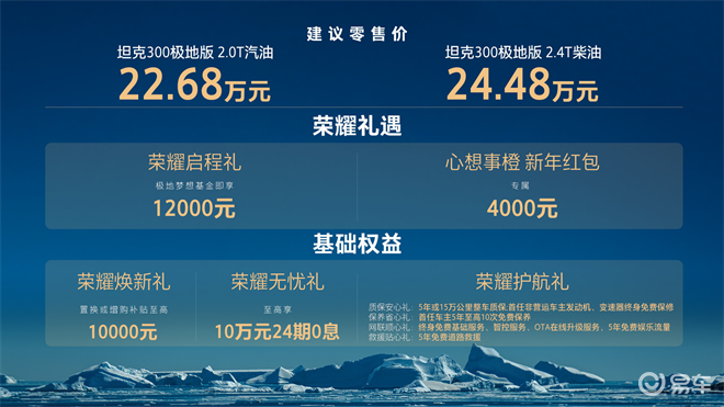 在坦克300全球用户突破50万之际,一款专为极地环境打造的全新车型——坦克300极地版正式登陆市场。这款新车提供2.0T汽油和2.4T柴油两种动力版本,官方指导价分别为22.68万元和24.48万元,一经推出便引发市场高度关注。