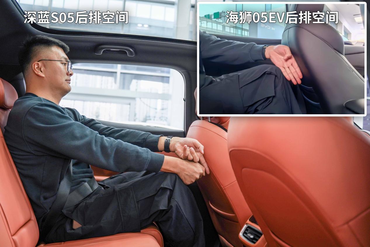 轴距长,车内空间表现如何呢?为了验证这一点,身高186cm、体重85kg的体验者,将两款车的前排座椅调整到正常驾驶位置后,坐进后排。深蓝S05的腿部空间剩余1拳2指,而海狮05EV的腿部空间剩余4指。显然,深蓝S05凭借更长的轴距,后排腿部空间更加宽敞。