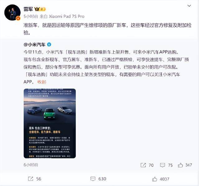 针对准新车的具体定义,小米集团董事长雷军通过社交平台解释称,这类车辆主要因物流运输过程中产生的轻微损伤,经原厂专业修复并完成附加检测后重新投放市场。所有修复流程均遵循官方标准,确保车辆性能与全新车保持一致,同时提供与全新车同等的售后服务保障。