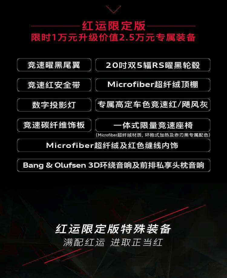 上汽奥迪近日推出A5L Sportback“红运限定版”车型,限量发售500台,限时臻享价为29.19万元。这款特别版车型以专属“竞速红”车漆为核心亮点,搭配曜黑尾翼、竞速红安全带、数字投影灯及红色缝线内饰等定制化配置,消费者仅需额外支付1万元即可完成升级。同时,车辆标配Bang & Olufsen 3D环绕音响系统,进一步强化豪华质感。