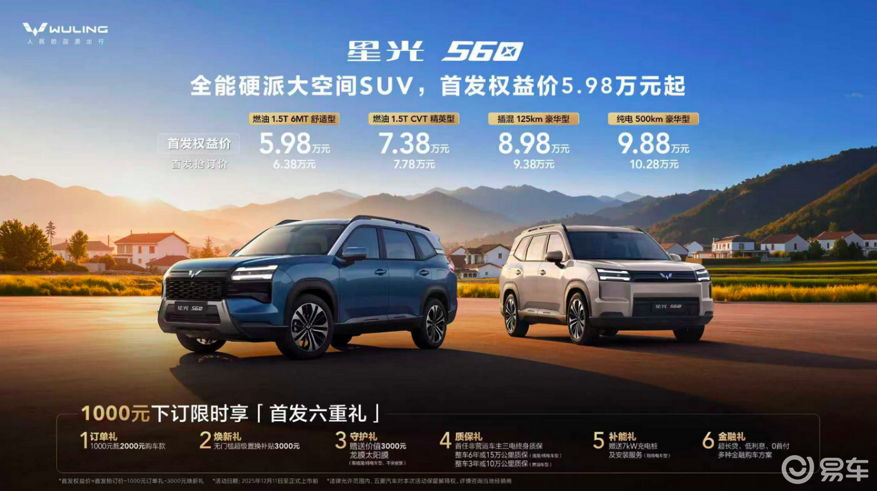 在2025东盟国际车展的舞台上,上汽通用五菱携全新力作——星光560正式登场。这款被定义为“全能硬派大空间SUV”的车型,凭借燃油、插混、纯电三种动力模式齐发的战略布局,以5.98 - 9.88万元的首发权益价强势杀入市场,瞬间成为车展焦点,引发行业内外的高度关注。