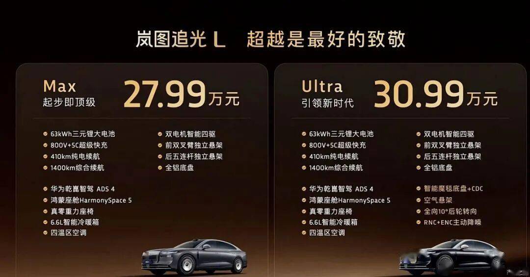 近日,岚图品牌旗下全新中大型插电混动轿车——岚图追光L正式登陆市场,共推出Max与Ultra两款配置车型,官方指导价区间为27.99万至30.99万元。这款新车凭借超过5.1米的车身长度、800V高压架构以及华为乾崑智驾ADS 4系统等核心配置,成为中大型轿车领域的新焦点。
