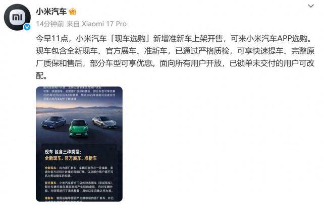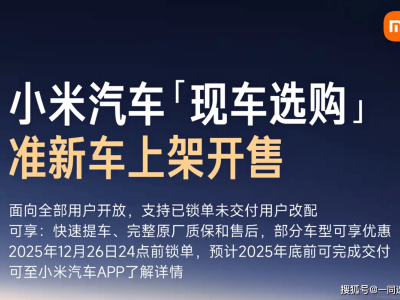 小米汽车官方今日正式对外发布消息,其「现车选购」服务迎来重要更新——准新车正式上架开售。用户可通过小米汽车APP进行选购,体验更加便捷的购车流程。