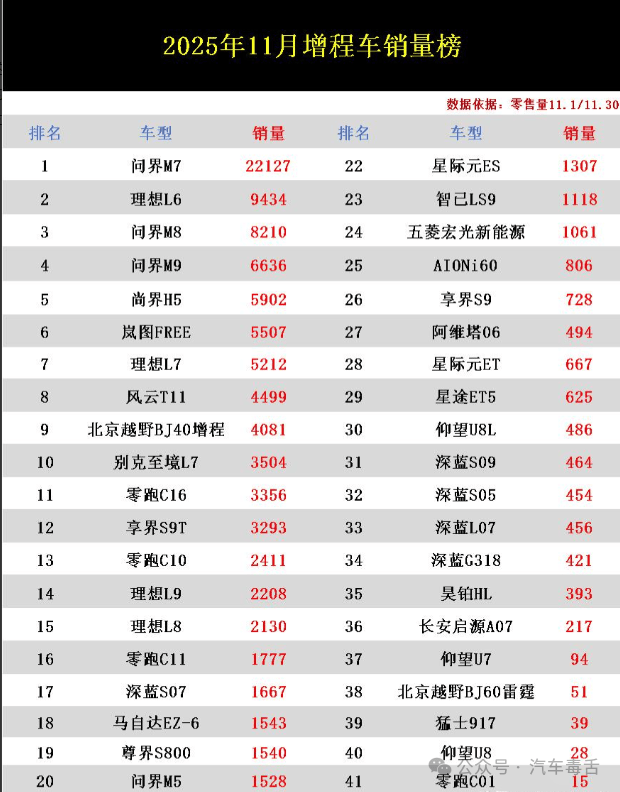 曾经被视为过渡性技术的增程式电动汽车,如今正以惊人的速度闯入主流消费市场,成为越来越多购车者的首选。最新公布的零售数据显示,2025年11月增程车型销量榜单中,共有42款车型上榜,这一数字不仅刷新了历史纪录,更折射出市场格局的深刻变化——从新势力品牌到传统车企,各方势力正围绕这条技术路线展开激烈角逐。