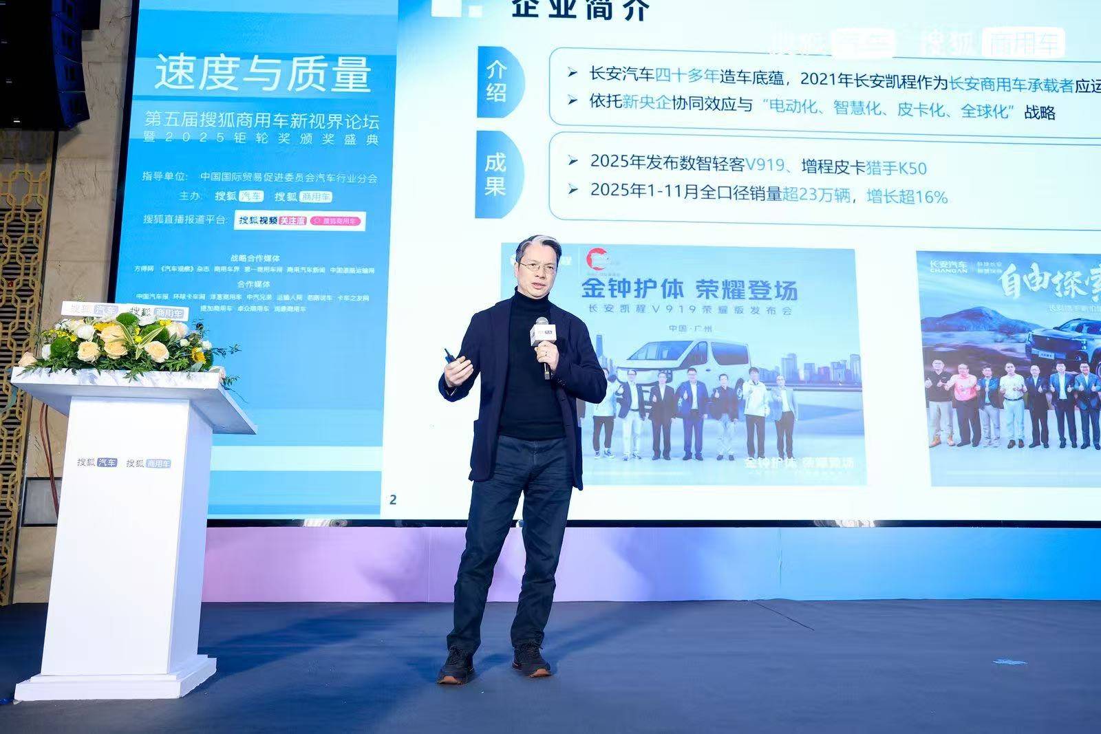 在主题为“速度与质量”的第五届搜狐商用车新视界论坛暨2025钜轮奖颁奖盛典上,长安凯程总裁董晨睿发表了关于企业战略与行业趋势的深度演讲。他指出,新能源技术与智慧化转型是商用车行业突破发展瓶颈的核心路径,而皮卡与全球化布局将成为企业实现“世界一流品牌”目标的关键支撑。