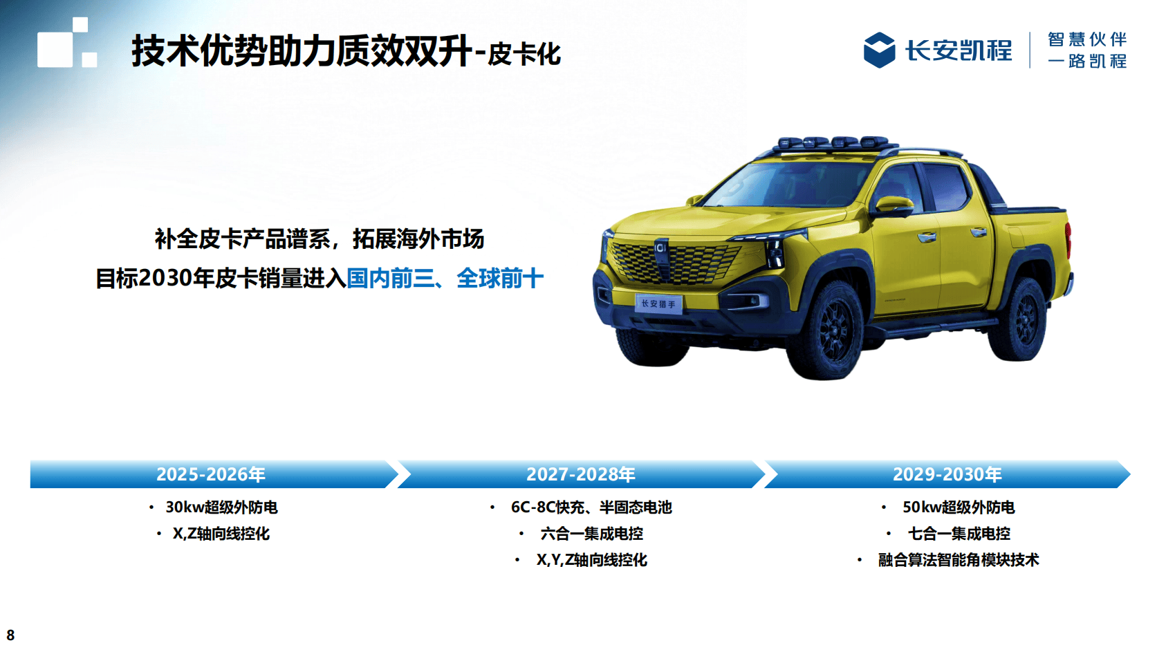 皮卡战略是长安凯程全球化布局的重要支点。董晨睿分析,国内皮卡年销量不足30万辆,但全球市场占比达45%。为抓住这一机遇,企业计划补齐皮卡产品谱系并推出SUV版本,同时重点开拓海外核心市场。2030年目标包括:皮卡年销量超20万辆(国内前三、全球前十),海外销量占比超40%(有望达50%)。全球化运营方面,长安凯程已构建五大海外事业部,覆盖欧亚、欧洲、中东非、东南亚及中南美市场,未来将新增10个海外KD中心,团队规模扩充至1000人以上,目标在12个市场实现万台级销量。