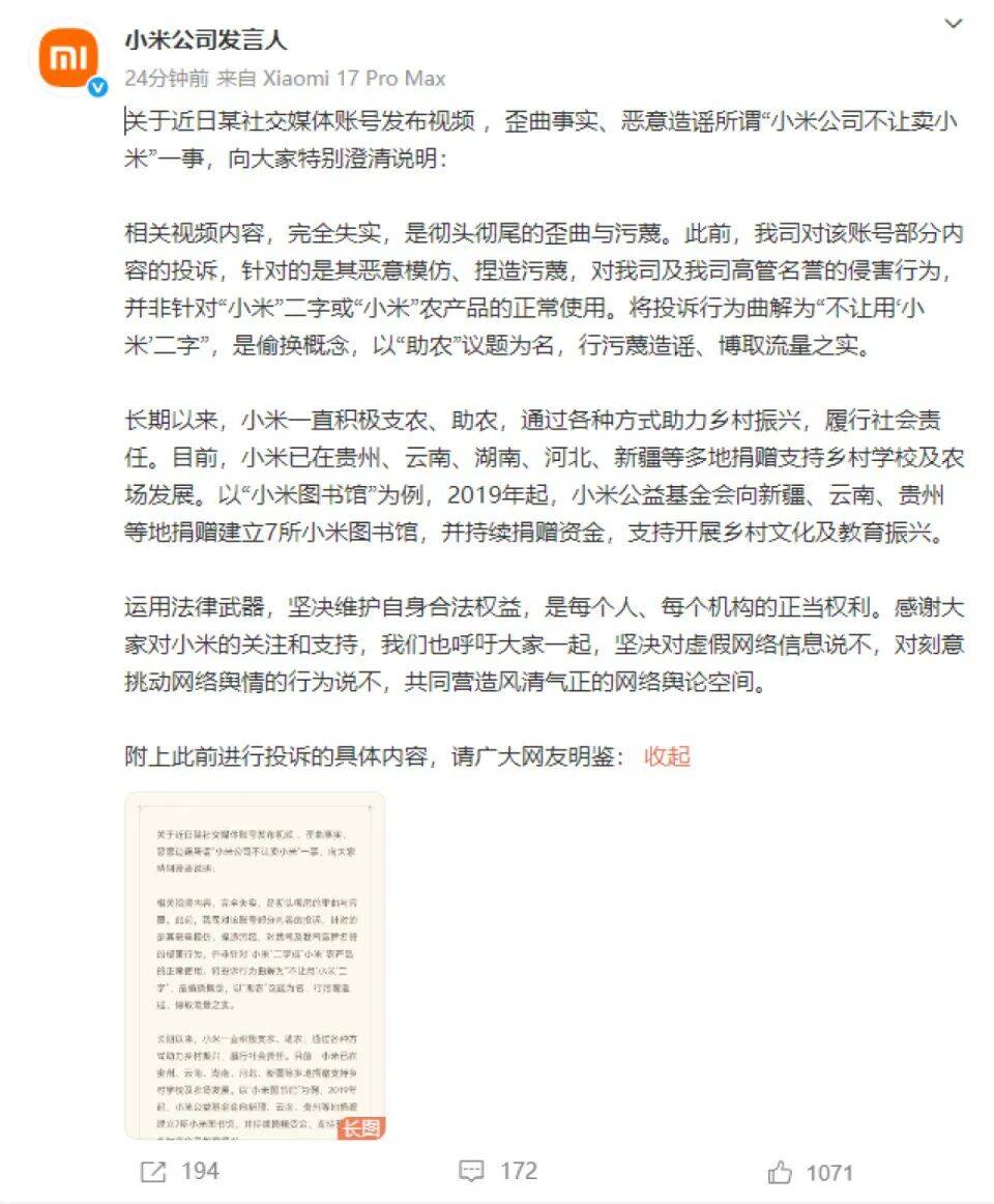 当日下午4点51分,“小米公司发言人”通过微博发布声明,称相关视频内容严重失实,是对公司的恶意歪曲与污蔑。此前公司针对某账号的投诉,主要针对其恶意模仿、捏造污蔑行为,侵害了公司及高管的合法权益,而非限制“小米”二字或相关农产品的正常使用。将投诉行为曲解为“禁用‘小米’”,是偷换概念,借“助农”之名博取流量、造谣污蔑。声明中还附上了此前投诉冯某宽的具体内容。