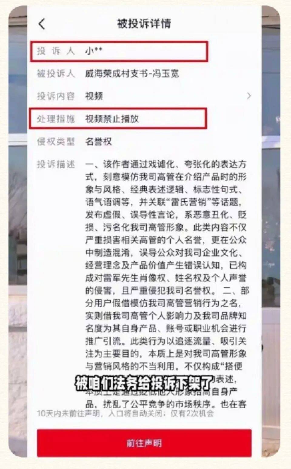 根据小米公司提供的投诉描述,该账号通过戏谑、夸张的表达方式,刻意模仿公司高管介绍产品时的形象、风格、表述逻辑、标志性句式及语气语调,并关联“雷氏营销”等话题,发布虚假、误导性言论。这些行为恶意丑化、贬损、污名化高管形象,构成对雷军肖像权、姓名权及个人声誉的侵害,同时严重侵犯公司名誉权。