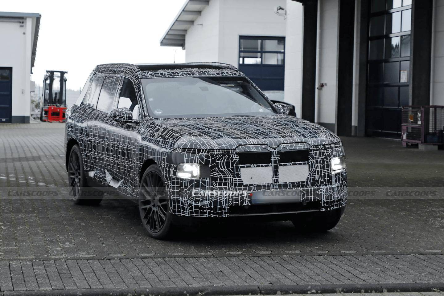 从外观来看,新一代X7的设计语言发生了显著变化。分体式LED大灯成为前脸的标志性元素,搭配尺寸进一步扩大的双肾格栅,整体造型更具视觉冲击力。前包围经过重新设计,进气口轮廓更加方正,大灯位置下移并收紧,营造出更运动的气质。车身侧面线条简洁流畅,轮拱造型清晰,传统门把手被半隐藏式结构取代,旨在优化空气动力学性能。D柱区域的霍夫迈斯特拐角特征得到强化,延续了宝马的经典设计元素。车尾部分仍处于高度保密状态,测试车使用了临时尾灯,但量产版本预计将采用贯穿式尾灯设计。