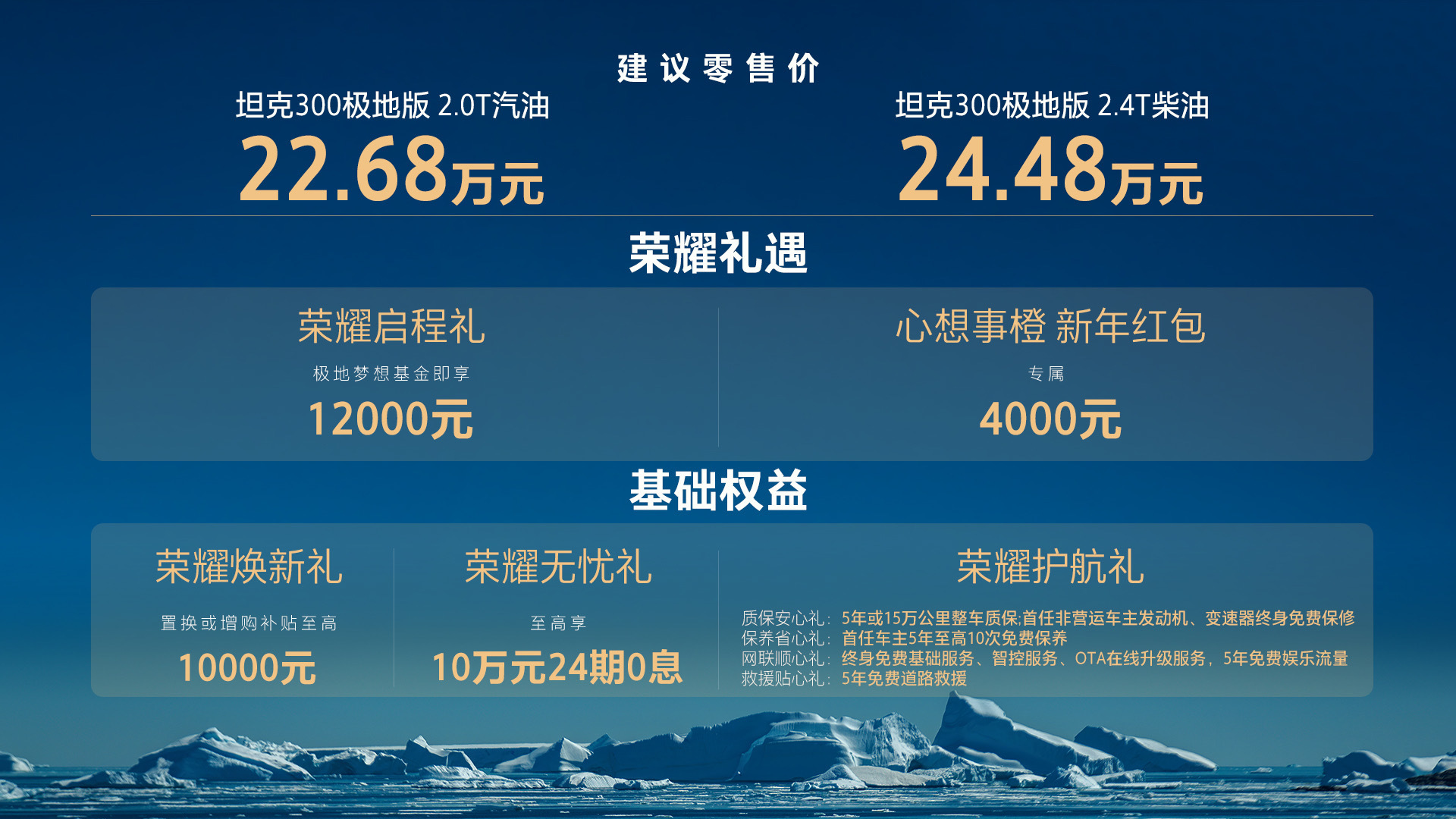 在硬派越野市场持续掀起热潮的坦克300,于全球用户突破50万之际推出全新力作——极地版车型。这款以“为国探极”为使命打造的专属版本,不仅延续了品牌硬核基因,更通过多项创新配置与用户共创成果,重新定义了全场景越野的标杆。新车提供2.0T汽油与2.4T柴油双动力选择,官方指导价分别为22.68万元和24.48万元,同步推出涵盖金融礼遇、保养权益及定制装备的多重购车方案。