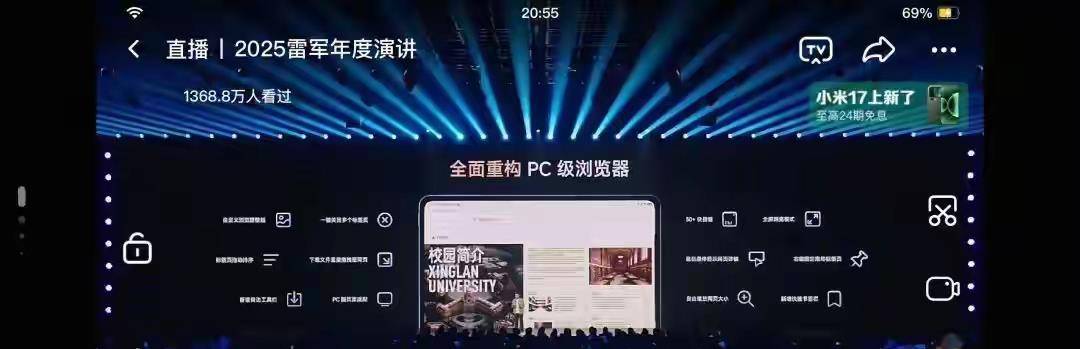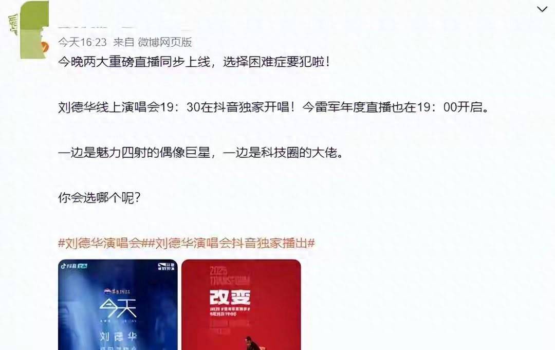 数据直观展现了这场“隔空对决”的火爆程度。刘德华线上演唱会开场仅半小时,连续演绎七首经典曲目,观看人次便突破1498万大关,弹幕区“华仔永远的神”等留言如潮水般涌动。与此同时,雷军年度演讲在小米直播间拉开帷幕,其关于科技趋势的洞察与幽默自嘲引发强烈共鸣,相关话题迅速登上各大热搜榜单。有网友戏称:“左手是刻进DNA的青春记忆,右手是改变生活的科技密码,这选择比高考报志愿还难。”