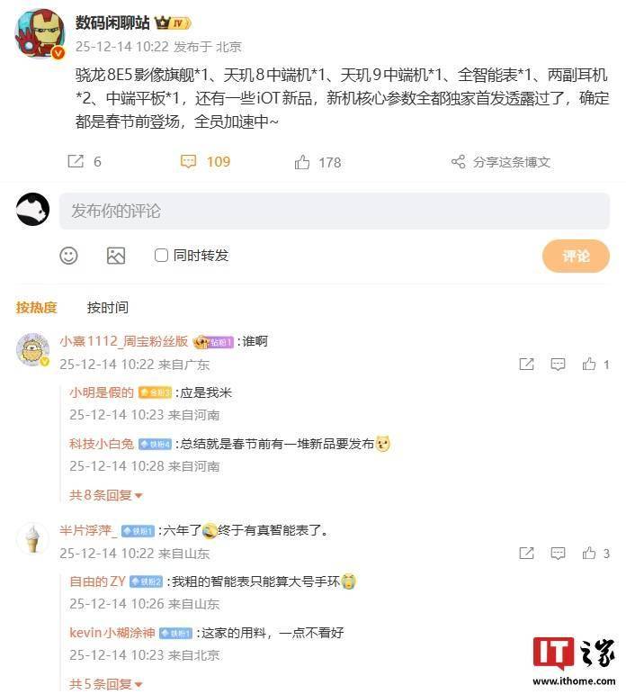 近日,知名数码博主在社交平台爆料,某知名手机厂商计划在春节前推出一系列新品,结合评论区讨论推测,该厂商为小米。此次新品阵容丰富,涵盖手机、智能手表、耳机、平板以及部分 IoT 产品。