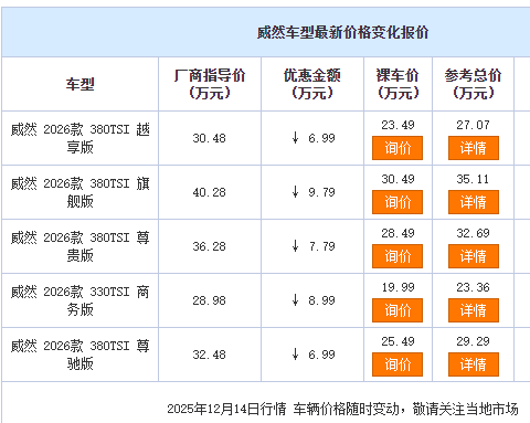 一场突如其来的价格风暴正在中大型MPV市场掀起巨浪。上汽大众威然以最高12.29万元的优惠力度杀入战场,旗舰版车型从40.28万元骤降至28万元区间,部分地区叠加补贴后入门版裸车价甚至下探至17万元级,这一动作直接将合资品牌的价格防线撕开一道缺口。