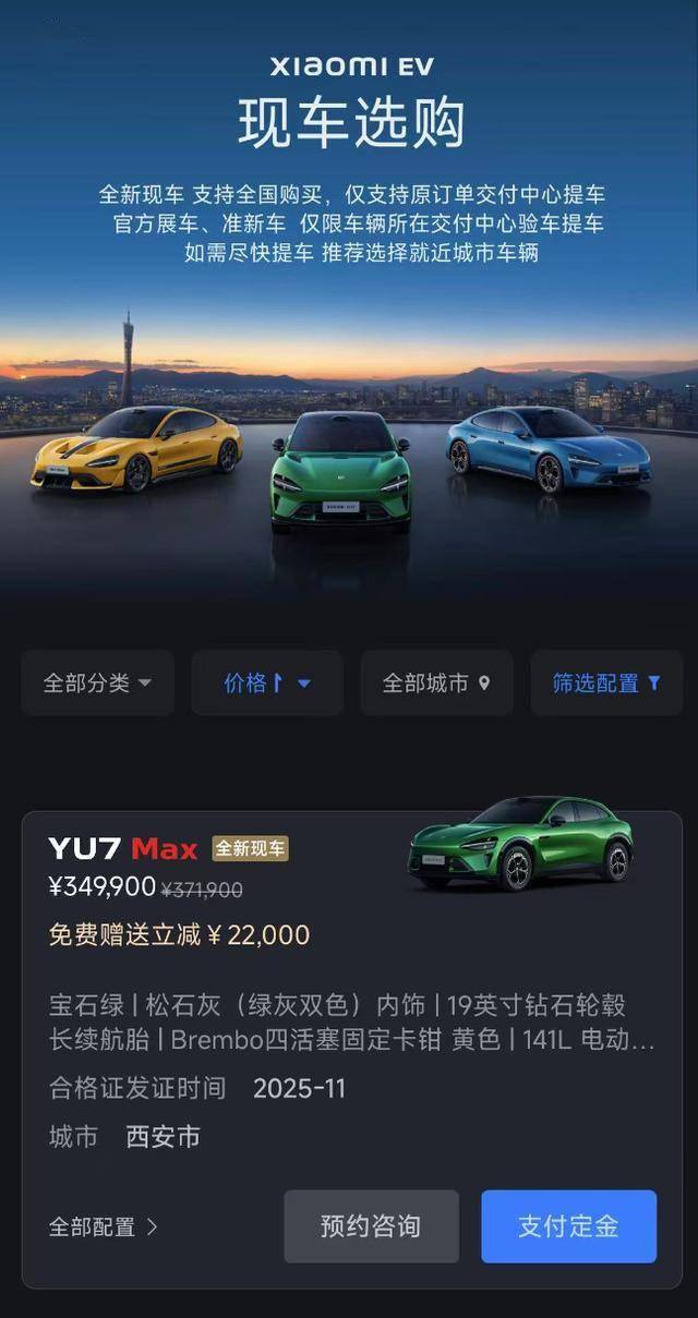从APP展示信息来看,首批参与现车选购的车型集中在YU7和SU7的顶配版本,售价普遍超过30万元。这些车型不仅配置高端,更通过限时优惠活动降低了购车门槛。市场分析认为,此举有助于小米汽车在高端市场进一步扩大份额,同时提升用户购车体验。