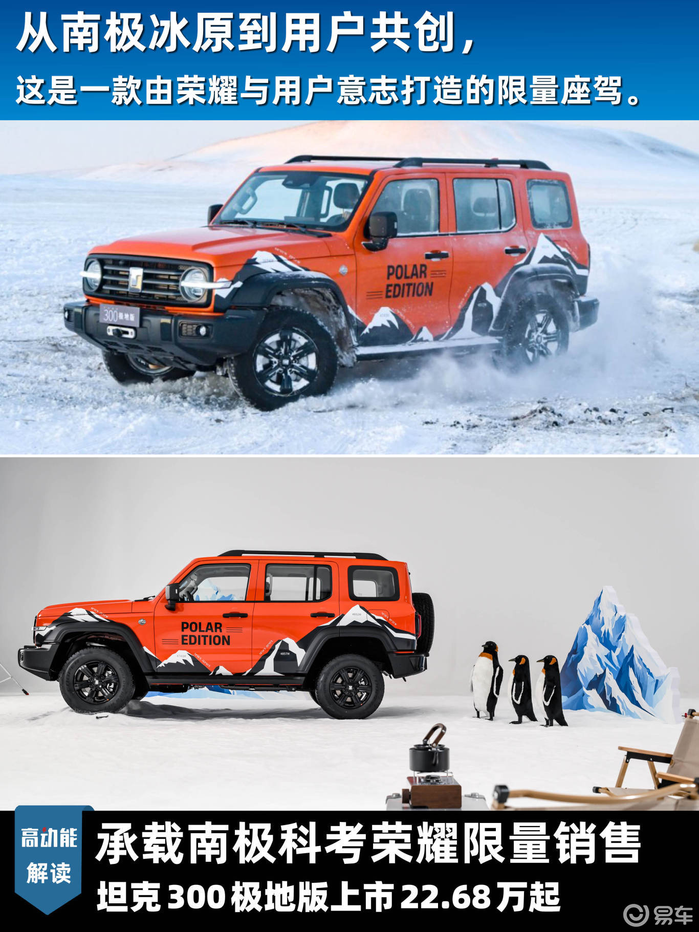 在中国第42次南极科考启航仪式上,一抹橙色身影引发关注——坦克300极地版作为首款登陆南极大陆的中国品牌汽车,以特殊身份完成首秀。这款承载着科考荣誉的硬派越野车,近日正式宣布上市,推出2.0T汽油与2.4T柴油双动力版本,官方指导价分别为22.68万元和24.48万元。