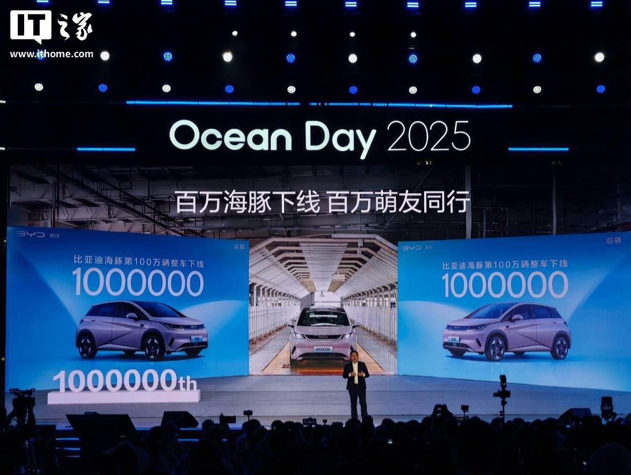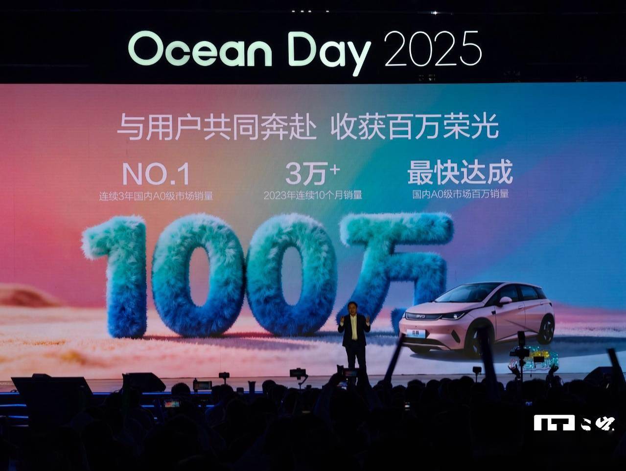 在“奔涌 2025”比亚迪海洋四周年Ocean Day用户盛典上,比亚迪迎来了一个重要里程碑——第100万辆海豚正式下线。这款纯电动小型车自2021年8月首次亮相以来,迅速成为国内A0级市场的明星车型,不仅最快达成百万销量,还连续三年蝉联该细分市场销量冠军,并在2023年创下连续10个月销量突破3万辆的佳绩。