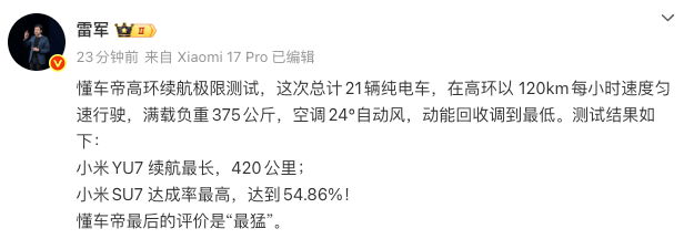在懂车帝最新公布的纯电动车“极限续航测试”榜单中,小米汽车旗下两款车型凭借出色表现成为焦点。其中,小米SU7以54.86%的续航达成率在20万元级细分市场拔得头筹,而小米YU7则以420公里的实测总里程刷新同组别续航纪录,展现出强劲的技术实力。