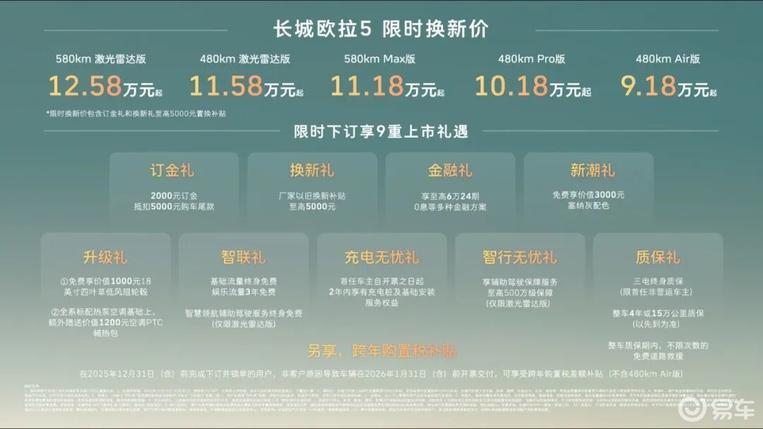 欧拉品牌此次不仅带来了新车,还宣布了其战略转型的重大决定。未来,欧拉将不再局限于纯电车型,而是将目光投向更广阔的市场,致力于打造面向多种动力形式的全球品牌。为了回馈广大用户的厚爱,欧拉品牌推出了一系列购车优惠,即日起至2025年12月31日,用户下订并锁单即可享受包括订金礼、换新礼、智行无忧礼在内的9重上市好礼,以及跨年购置税补贴(不含480km Air版)等丰厚购车权益。这一系列举措,无疑将进一步增强长城欧拉5的市场竞争力。