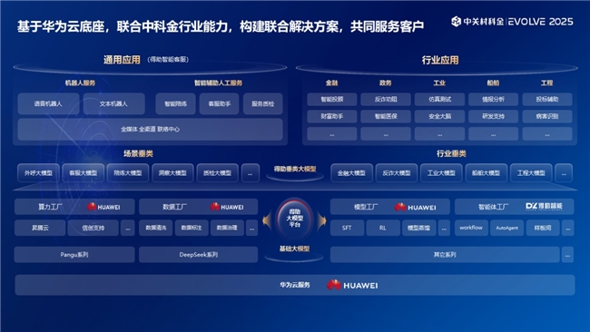 华为云与中关村科金的联合解决方案基于华为昇腾云平台构建,打造AI+全场景,高效开发AI应用、快速验证,提升产品竞争力。华为昇腾云支持使用各类主流大模型打造可持续发展的模型平台, DeepSeek模型深度适配,并行调优提升62%,且异构NPU使调度利用效率提升20%,自主创新适配使用昇腾NPU建设,效率提升20%。