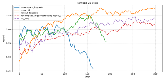 图中mean_8(黄线)代表我们提出的抑制采样噪声方法,其余曲线为TIS等业界常用方法。对比可见,我们的方法能获得更好的训练效果。